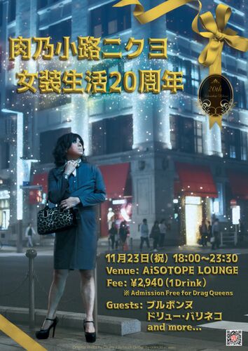 11月23日(水・祝日)は 肉乃小路ニクヨ女装20周年パーティーです。 フライヤーのQRコードからも飛べる用の日記です。 まずはパーティーの基本情報からご案内します。 肉乃小路ニクヨ女装20周年日時:11月23日(祝)18:00〜23:30 会場:AISOTOPE LOUNGE ht…